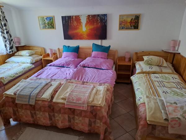 Hálószoba 2: 2 darab egyszemélyes ágy, 1 darab francia ágy (2 főnek) Fürdőszoba